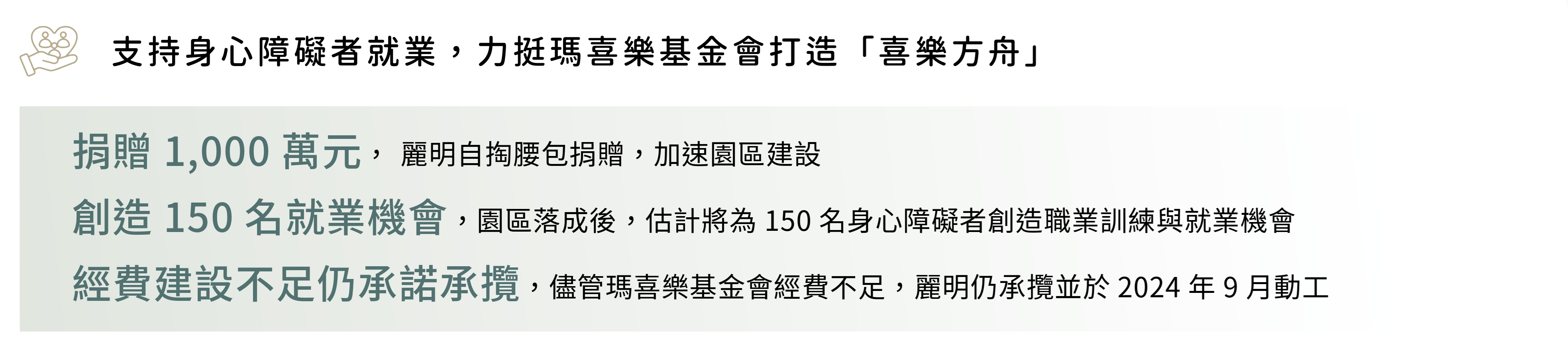 麗明營造透過本業專業,將營造價值延伸至社會關懷,落實「世界因為有麗明而更加美好與友善」的企業使命。未來,麗明營造將持續關注弱勢群體,並攜手社會各界,確保「喜樂方舟」順利落成,讓身心障礙者擁有更多發展機會。