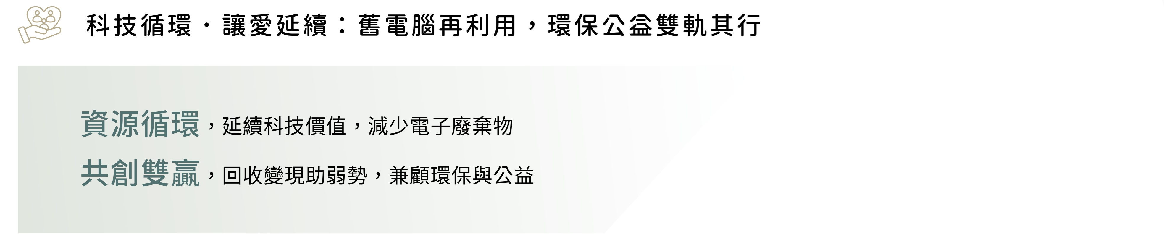 「科技循環.讓愛延續」 不只是一次性的回收行動,更是一項持續性的社會關懷計畫,讓科技與愛心在社會中不斷循環。
