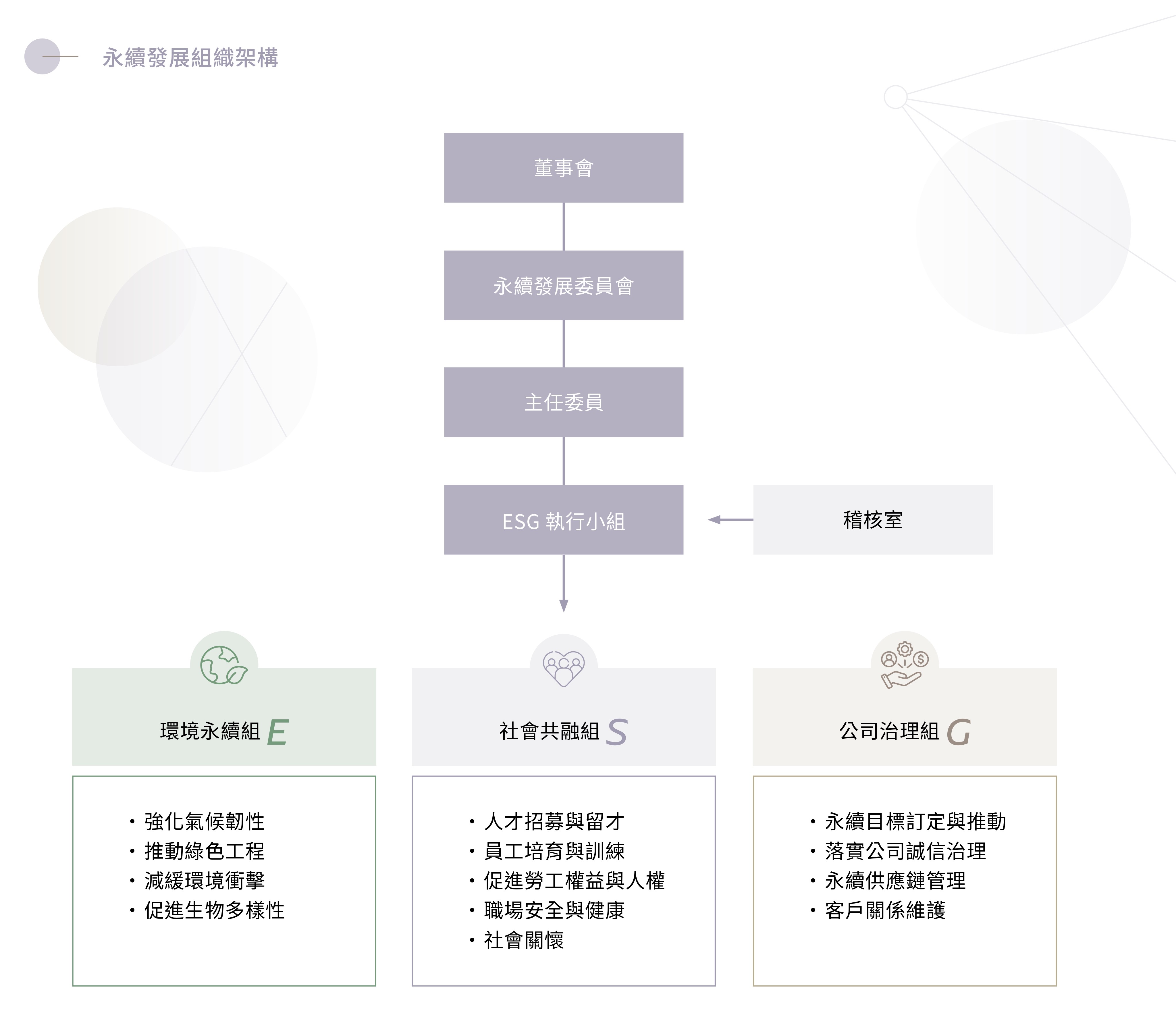 永續發展委員會由董事長吳春山擔任主任委員,各部門主管擔任委員。委員會每季召開會議,研討公司的永續政策與推動計畫,並且每年度向董事會報告執行成果及未來發展方向。2024 年度,董事會研討永續相關項目包含:重大性主題、氣候變遷因應、職場多元平等與包容、永續發展目標與績效追蹤及永續報告審閱。為提升永續發展委員會成員的ESG 專業素養,公司定期與外部專家交流合作,並積極參與「天下永續會」等產業聯盟、論壇與研討會,掌握國內外永續發展趨勢,強化實務應用。委員會持續優化ESG 策略規劃,確保企業永續方針與國際標準接軌,進一步提升企業競爭力及社會影響力。