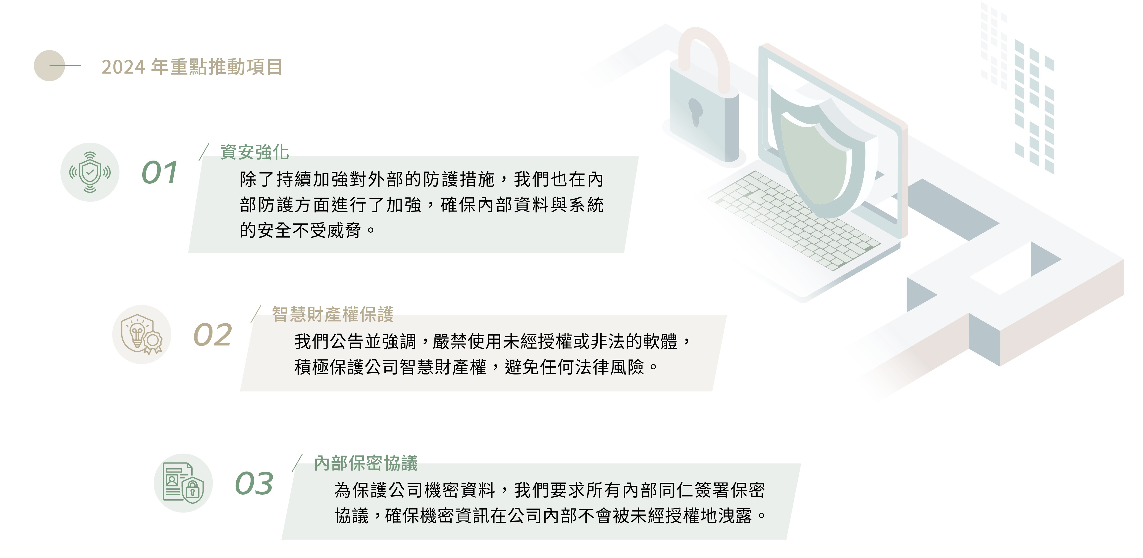 此外,我們與台積電的Panorays 供應鏈風險管理平台合作,定期進行弱點掃描,並根據報告結果不斷優化我們的安全措施。2024 年,麗明營造未發生任何資安事件,且未收到任何與資訊安全或個資保護相關的投訴。