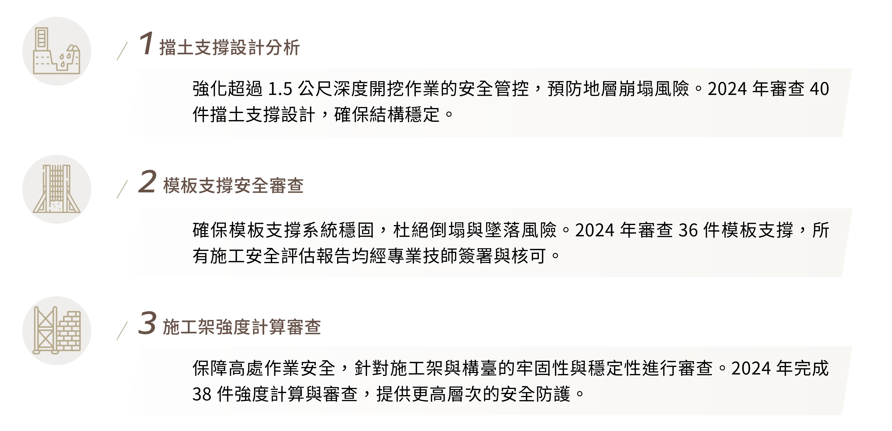 在每個建案中,我們透過溝通與諮商、範圍確認、風險評估,針對高風險項目加強稽核與審查。專業技師負責監督與審查工程計算、施工圖等關鍵文件,並於作業管制點投入資源,確保風險即時鑑別與控管。施工過程中,我們持續監測技術、環境與安全風險,透過應對機制迅速處理問題,降低對工程進度與品質的影響,促使各項作業全面符合最高安全規範,並同步維護未來建築使用者的健康與安全。