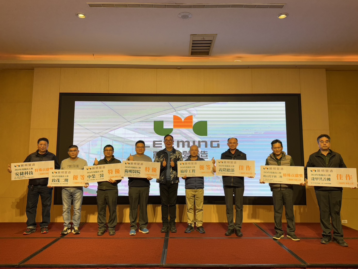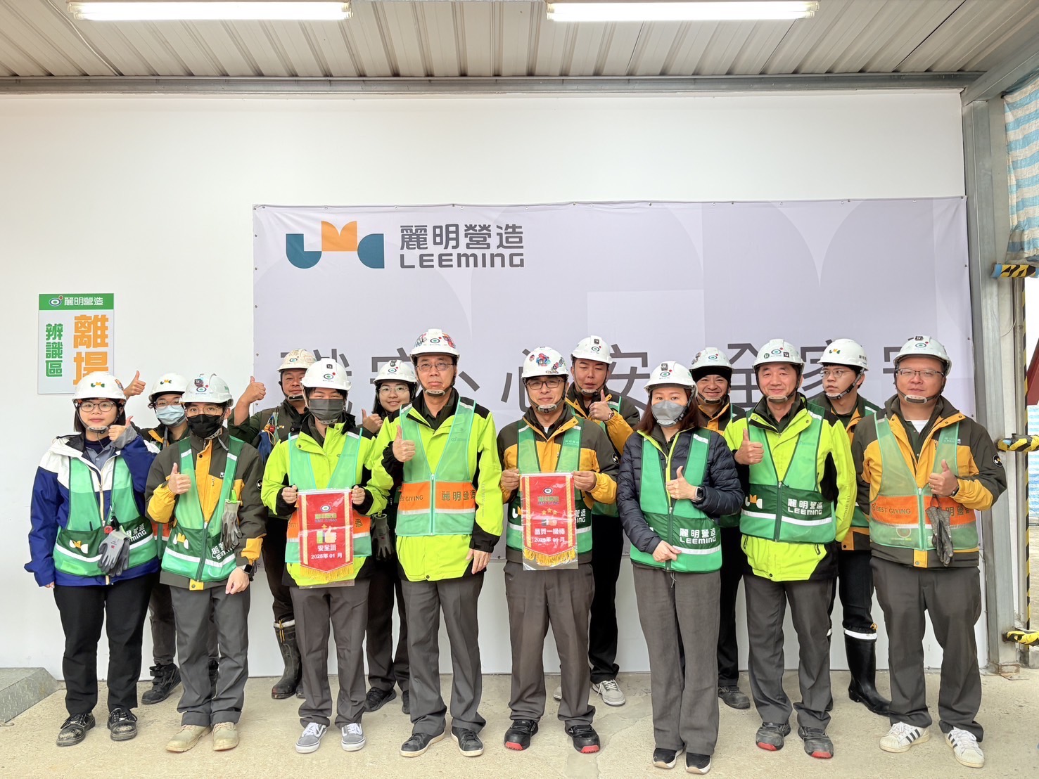 為激勵團隊長期投入品質管理與職安衛管理,我們於年末統計各工地累積的品質管理競賽與職安衛競賽累計的紅旗數量,並結合外部獲獎成績,評選年度優良工地,並於年底公開表揚。2024 年共有8 個工地獲獎,進一步提升各工地同仁的榮譽感與責任感,強化更穩健的工地管控機制。