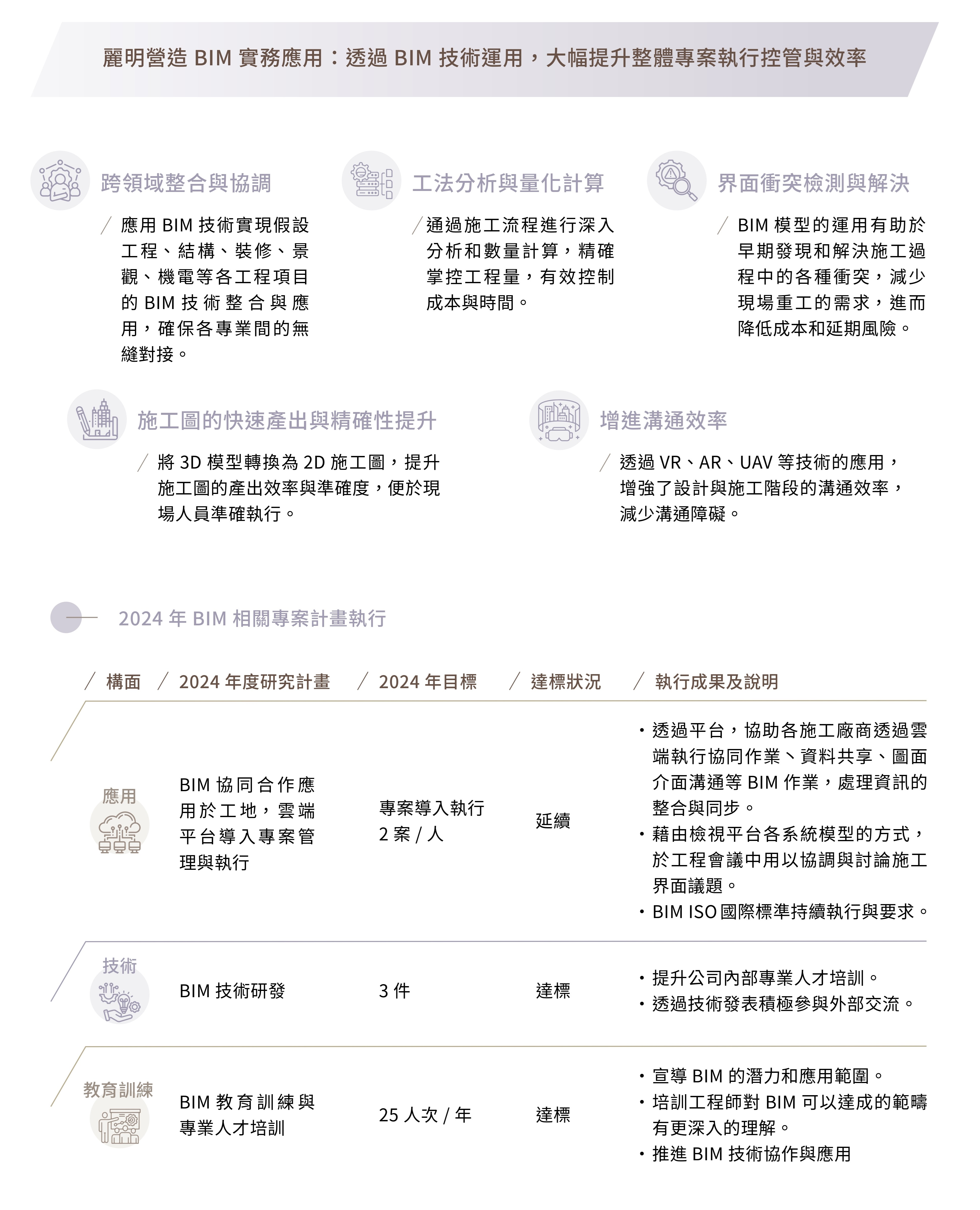 BIM 技術應用已逐漸成為各類公共工程投標的必要資格,為因應產業數位化趨勢,麗明營造積極超前部署,全面導入國際標準 ISO 19650-1、ISO19650-2 及ISO 19650-5,並持續優化 BIM 流程架構,使其更臻完善與實用。透過制度化的導入與實務應用整合,麗明營造不僅成功成為台灣首家同時通過 ISO 19650-1 與 ISO 19650-2 標準的營造公司,更榮獲亞洲首家取得國際最高品質保證「BSI BIM KiteMark」風箏標誌的殊榮,並領先全球 AECO 產業(建築、工程、營造、營運與維護)成為首家通過 ISO 19650-5 資訊安全標準的營造企業。