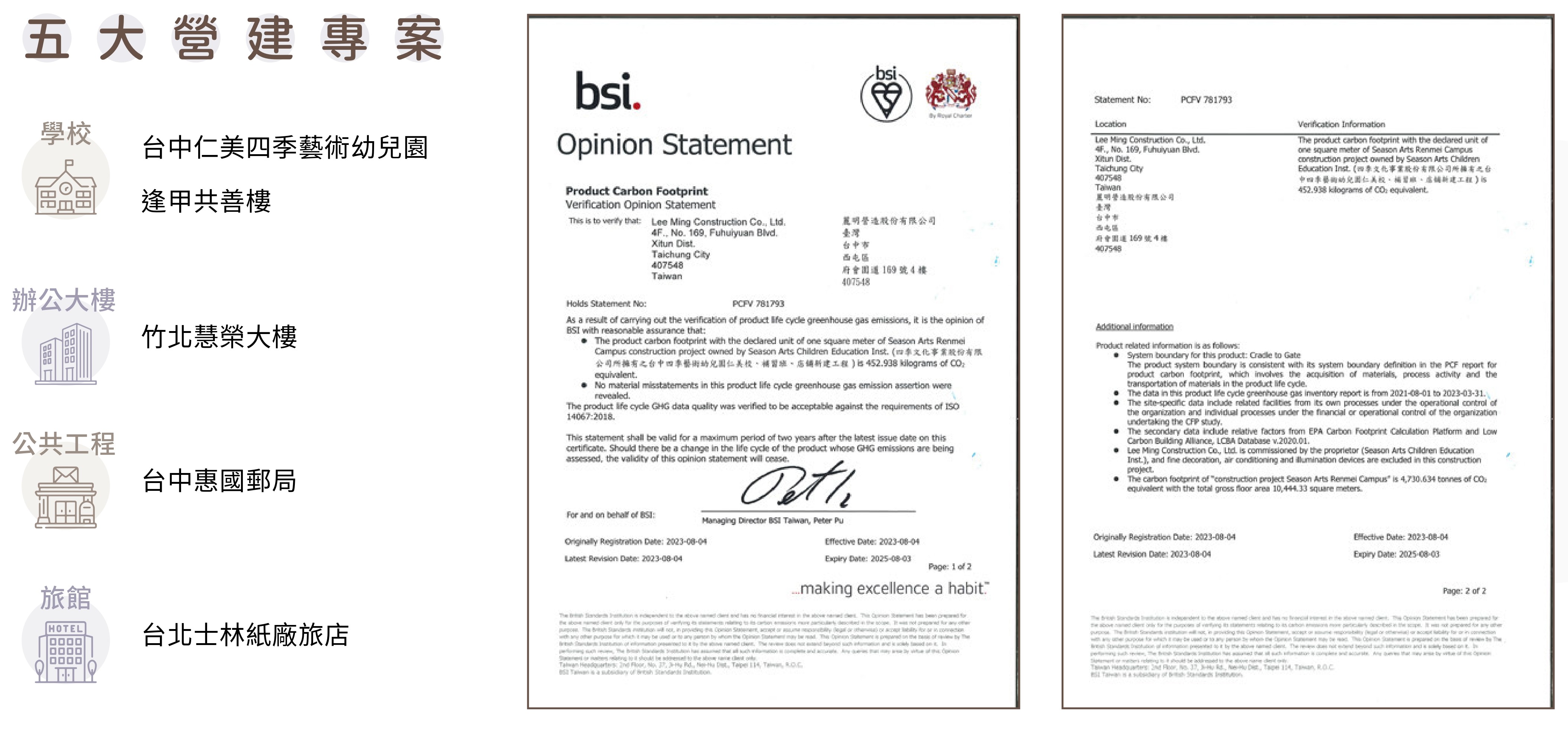 其中,麗明營造承攬的「台中仁美四季藝術幼兒園」成功通過英國標準協會(BSI)的 ISO 14067:2018 碳足跡標準查證,這不僅有助於公司精確掌握施工碳排放狀況,更進一步奠定了營建減碳決策的數據基礎,為未來低碳建築推動、減碳標準建立及施工效率提升提供有力支撐。