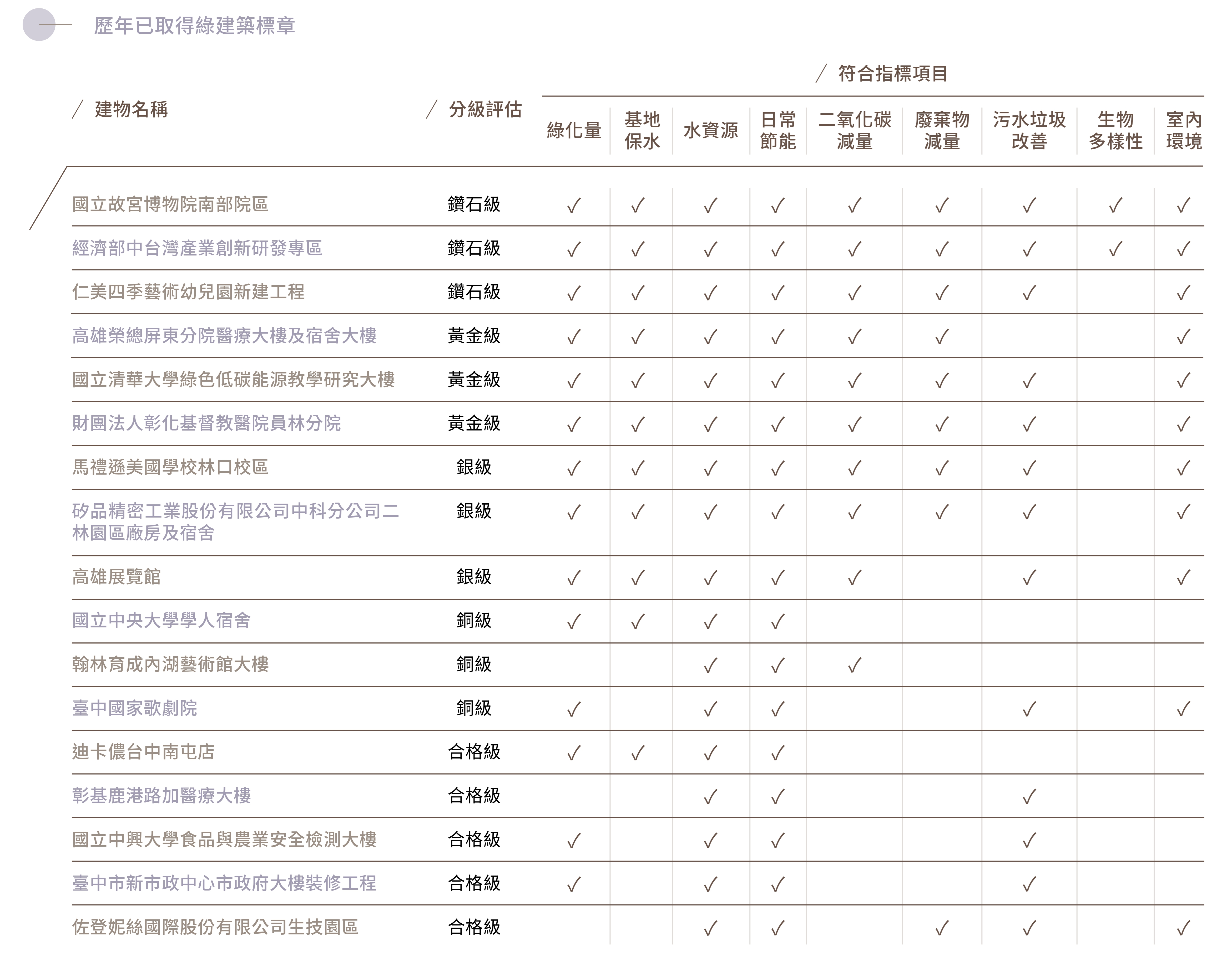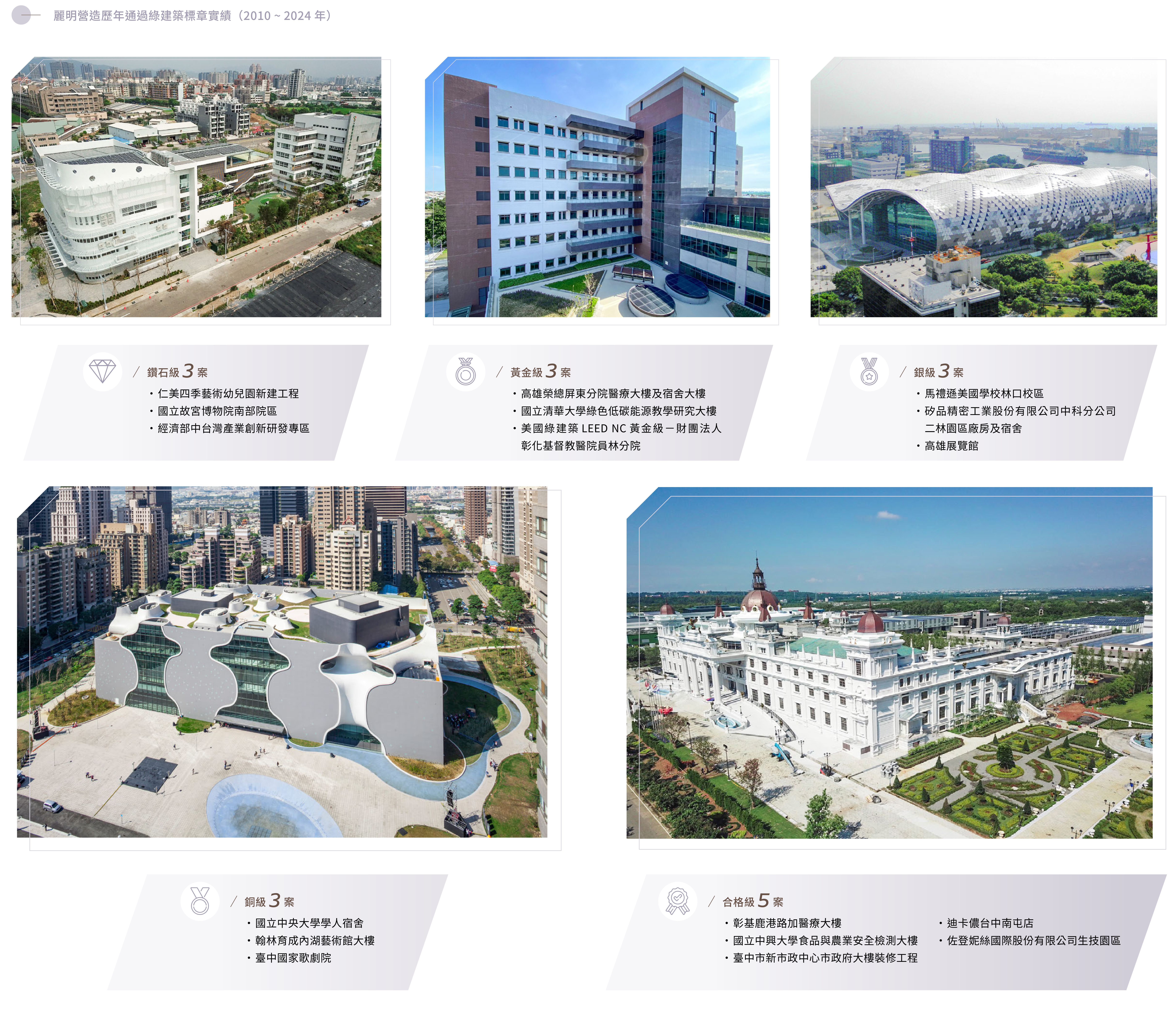 麗明營造自 2010 開始統計綠建築實績案件,以業主申請綠建築認證並取得綠建築標章之建案進行計算。2024 年新增 1 案,截至 2024 年共累積 17 案,成果斐然。