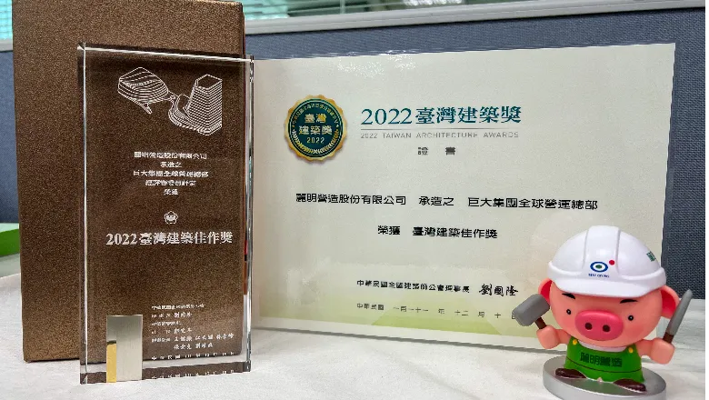 2022第四十四屆臺灣建築獎共有215件作品參賽,選出臺灣建築獎一件、臺灣建築佳作獎四件,其中由麗明營造所承攬的「巨大集團全球營運總部」榮獲2022台灣建築獎佳作獎。