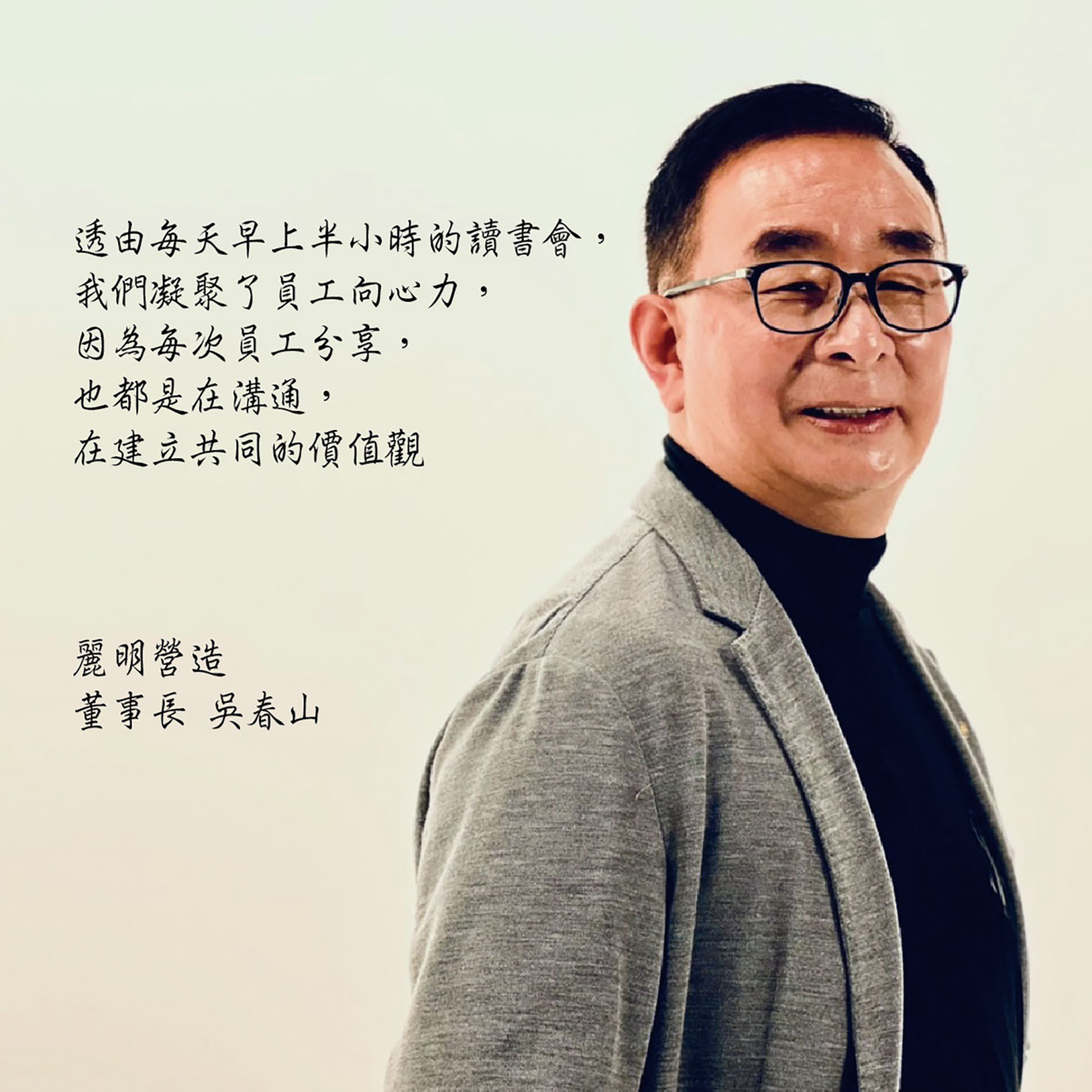 1996年,麗明營造創業不久,我看到日本一個精神喊話提振士氣的節目,覺得非常好就照著做,員工每天早上就圍成一圈,各自分享工作上心得,到後來有人分享他讀過具有啟發的文章,演變成公司的讀書會。