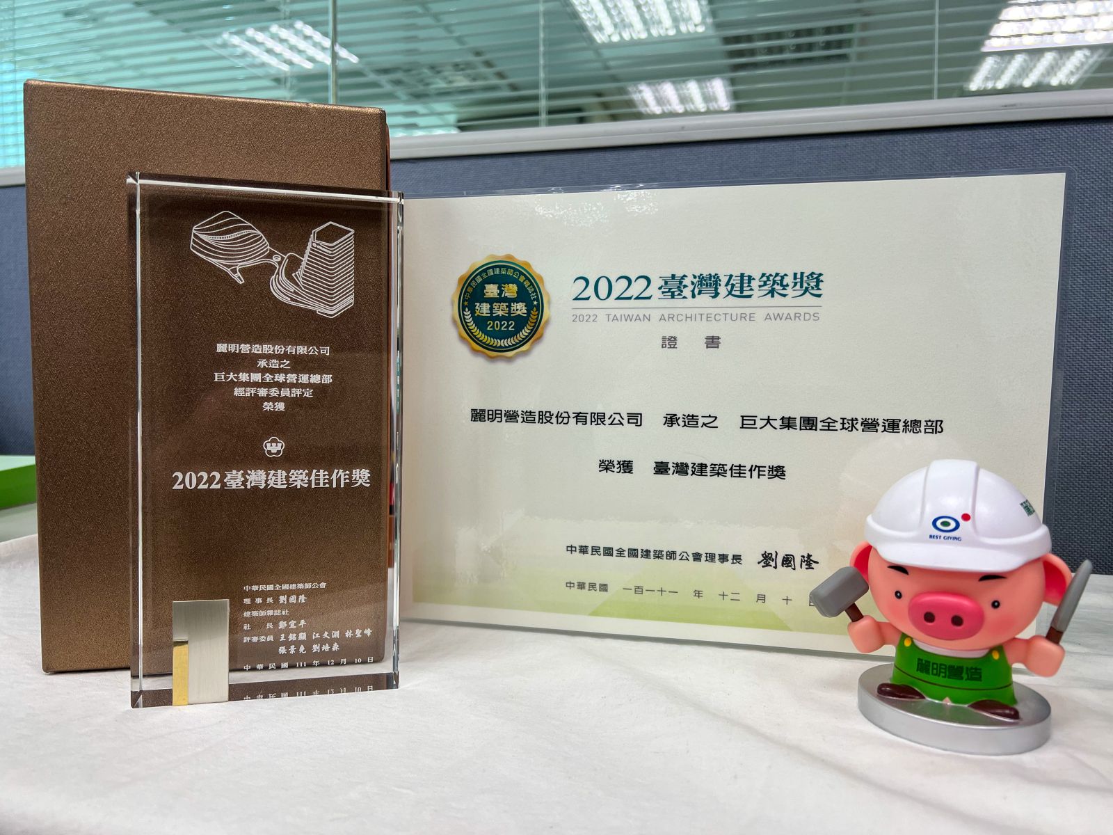 由潘冀聯合建築師事務所設計,麗明營造所承攬的「巨大集團全球營運總部」獲選為佳作。