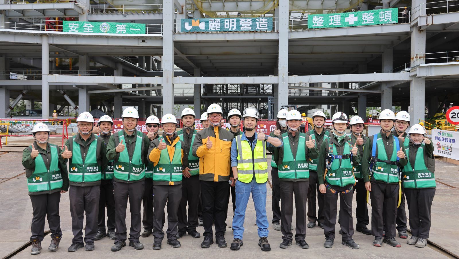 麗明營造以「全員工安、全員品質」為核心,董事長吳春山(前排左五,黃外套)現身工地宣示安全決心。